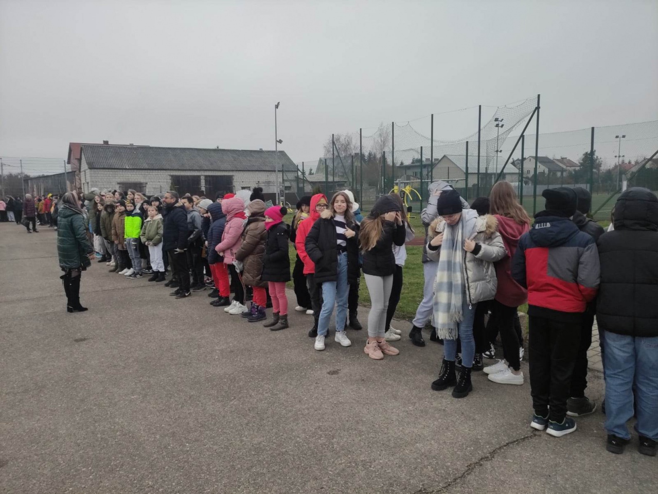 Wyprowadzenie uczniów z budynku przebiegało bardzo sprawnie – w ciągu 3 minut opuszczono wszystkie pomieszczenia, które pozostawiono otwarte (z pozostawionymi kluczami w zamkach) i udostępnione do sprawdzenia. Na boisku szkolnym (w odległości przekraczającej 50m od budynku) Dyrekcji szkoły zostały zgłoszone przez opiekunów stany liczbowe grup, które znajdowały się pod ich opieką.