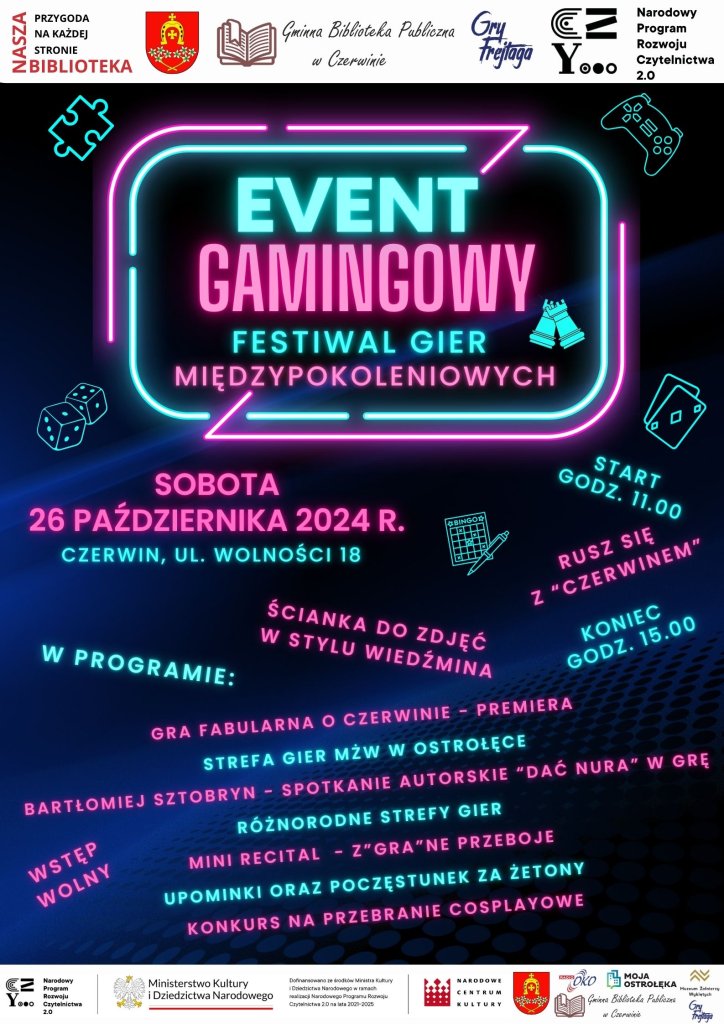 W sobotę, 26 października 2024 roku, Gminna Biblioteka Publiczna w Czerwinie organizuje pierwszy w historii gminy Event Gamingowy – Festiwal Gier Międzypokoleniowych.