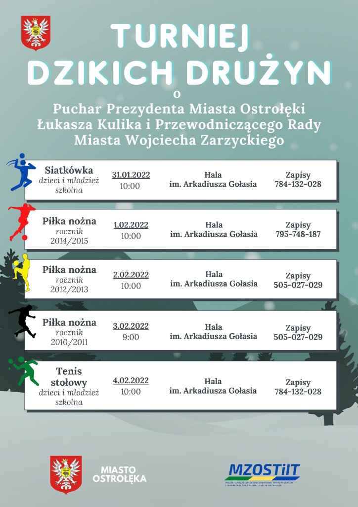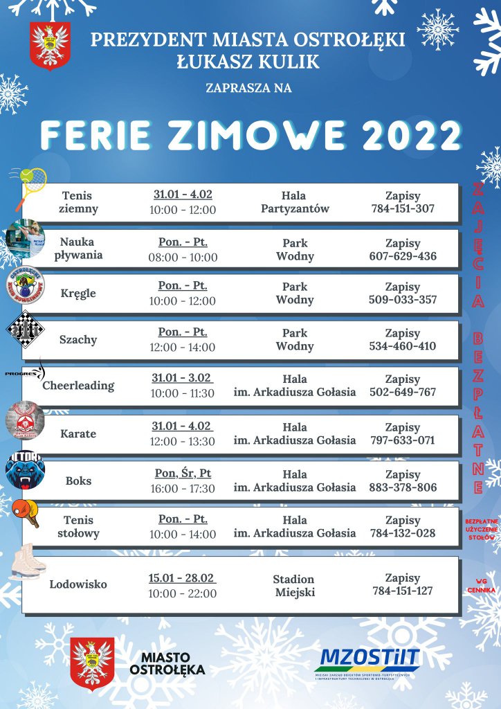 W ramach ferii zimowych przygotowano m.in. bezpłatne zajęcia sportowe z tenisa ziemnego, kręgli, szachów, karate, boksu, cheerleadingu oraz tenisa stołowego. Jest też lodowisko oraz nauka pływania. Odbędą się też turnieje dzikich drużyn w siatkówce, piłce nożnej i tenisie stołowym.