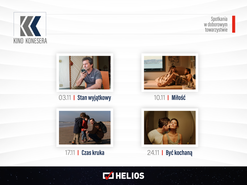 Poniedziałkowe popołudnia to czas dla cyklu Kino Konesera – 3 listopada w wybranych lokalizacjach zostanie wyświetlona czeska komedia „Stan wyjątkowy”. Zaskakujący film opowiada o radiowym korespondencie wojennym, który z powodów osobistych musi wrócić do Pragi. Mimo to, nadal prowadzi programy, udając, że znajduje się w arabskim kraju, ogarniętym rewolucją… W czwartek, 6 listopada do wszystkich kin sieci zawita cykl Kultura Dostępna z polskim filmem familijnym „Skrzat. Nowy początek”. Przybliża on historię dziewczynki, która razem z nowo poznanym szkolnym outsiderem pragnie przekonać otoczenie o istnieniu magicznych stworzeń.