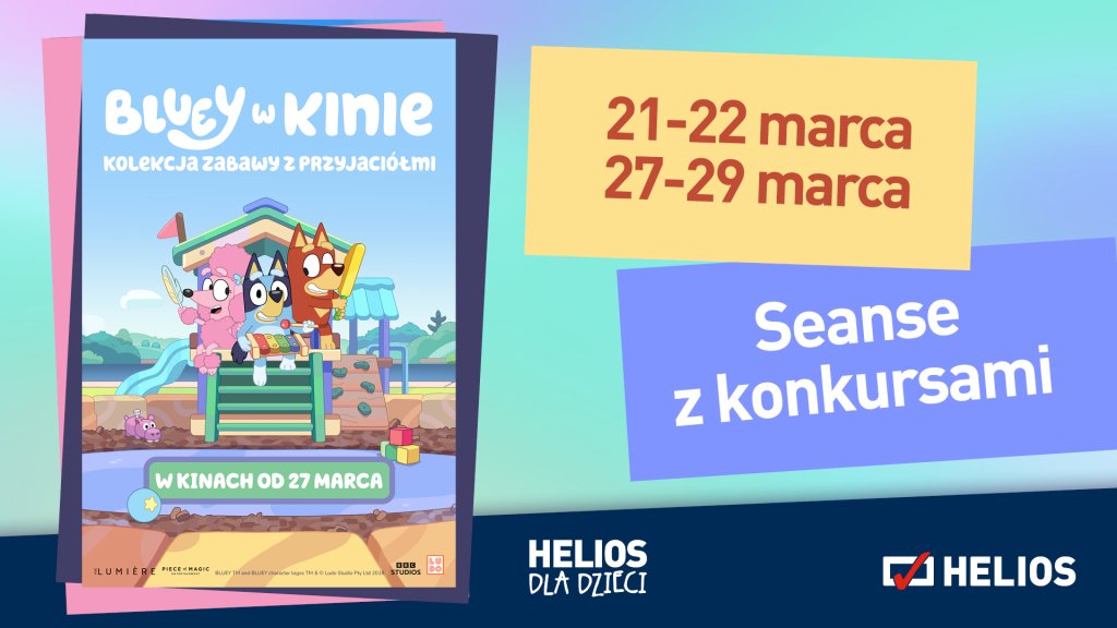 Innym pomysłem na rodzinny seans będzie polski tytuł „Za duży na bajki 3”. W trzeciej części Waldek musi zmierzyć się z konsekwencjami własnego błędu: jego z pozoru niewinny internetowy komentarz uruchamia falę nienawiści, która uderza w jego przyjaciółkę, Delfinę. Chłopak staje przed trudnym wyzwaniem i musi zdobyć się na odwagę, by przyznać się do winy i naprawić sytuację. Helios przygotował również seanse dla najmłodszych z popularną bajką. Seanse „Bluey w kinie: Kolekcja Zabawy z przyjaciółmi” zawitają do kina w sobotę i niedzielę, 21 i 22 marca, a będą towarzyszyć im konkursy dla dzieci.