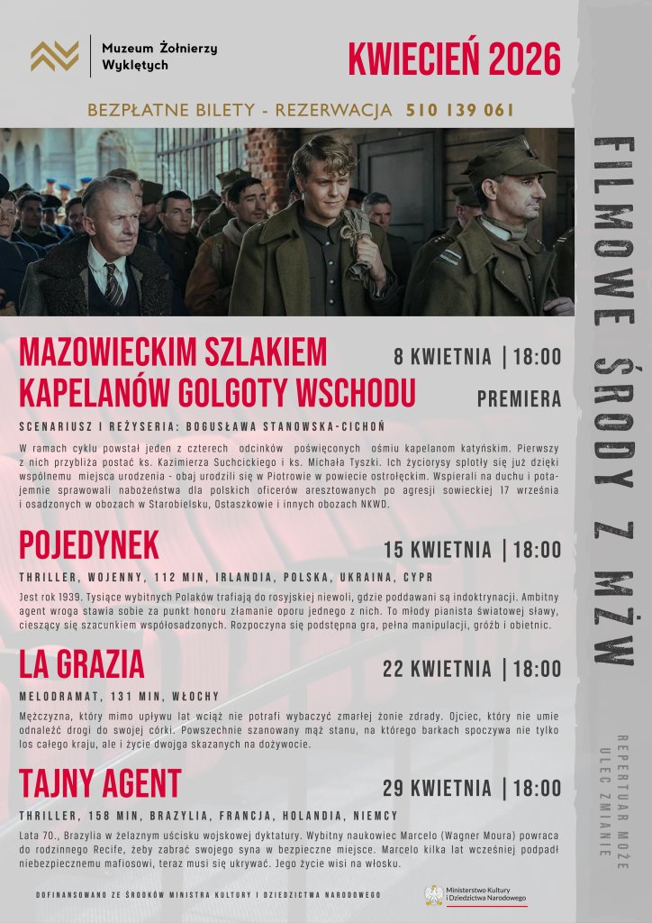 Muzeum Żołnierzy Wyklętych w Ostrołęce przygotowało listę filmów, które będzie można zobaczyć w ramach „Filmowych śród” w nadchodzącym miesiącu. W kwietniu na dużym ekranie pojawi się sporo emocji - od lokalnych historii i dramatów wojennych, po thrillery z różnych zakątków świata.