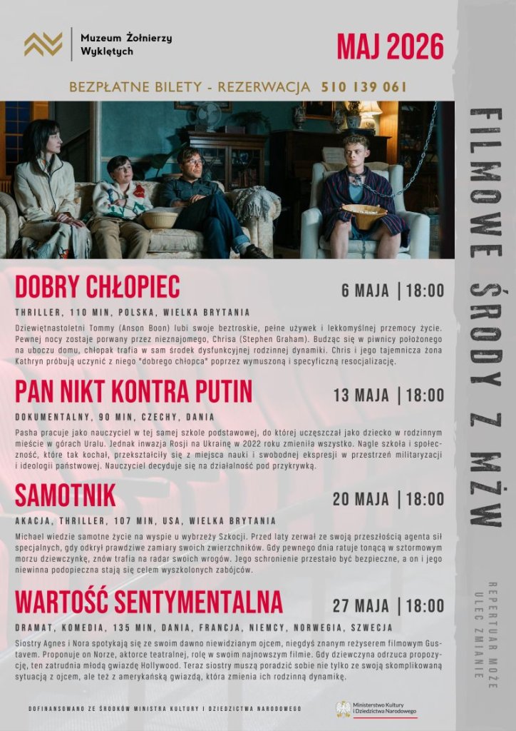 Muzeum Żołnierzy Wyklętych w Ostrołęce ogłosiło listę filmów, które będzie można obejrzeć w ramach „Filmowych śród” w maju. W programie znalazły się cztery produkcje - od thrillerów po dokument i dramat.