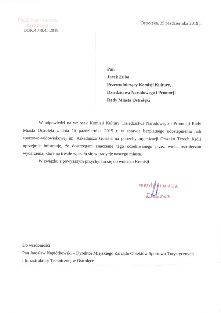 - Dostrzegam znaczenie tego oczekiwanego przez wielu ostrołęczan wydarzenia, które na trwałe wpisało się w tradycję naszego miasta. W związku z powyższym przychylam się do wniosku Komisji - podkreślił Kulik. Pismo publikujemy poniżej. Zostało ono przekierowane również do zarządcy hali, czyli dyrektora MZOS-TiIT Jarosława Napiórkowskiego.