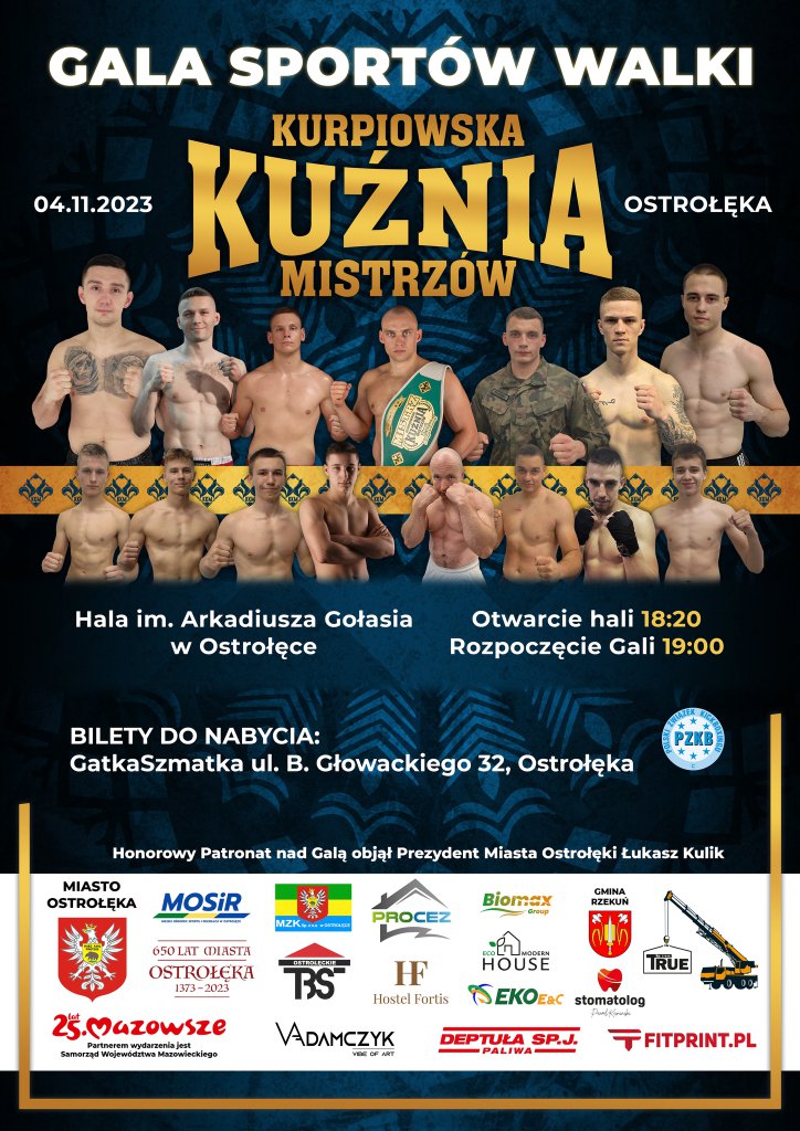 Ponadto o godzinie 10:15 wystartuje Liga Sportów Walki Kurpiowska Kuźnia Mistrzów. W ramach tej inicjatywy zaplanowano potężną dawkę zestawień w boksie oraz K1, również z ostrołęckimi akcentami. Wstęp na Ligę jest bezpłatny. Główna Gala Kurpiowska Kuźnia Mistrzów rozpocznie się o godzinie 19:00. Bilety do nabycia w siedzibie Fight Academy Ostrołęka ul. Prądzyńskiego 6 (Hala Targowa Feniks 1 piętro) oraz Restauracji GatkaSzmatka ul. B. Głowackiego 32 w Ostrołęce.