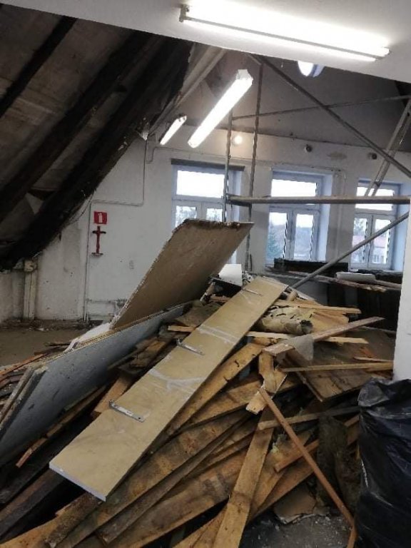 Dostaliśmy od wykonawcy tydzień na opróżnienie poddasza, czyli pracowni fotograficznej. Po tygodniu ekipa weszła na strych i rozpoczęła tam demolkę, a po kolejnym tygodniu udało się "wyczyścić" pracownie plastyczne i udostępnić je budowlańcom. Zarówno w piwnicy, jak i na dwóch najwyższych kondygnacjach budynku prace ruszyły „pełną parą”. Zostało nam jeszcze tylko wywiezienie wszystkich rzeczy z parteru oraz pierwszego piętra i …. opuszczamy budynek na czas remontu. Do zobaczenia w Kultowni, która zgodziła się nas przygarnąć.