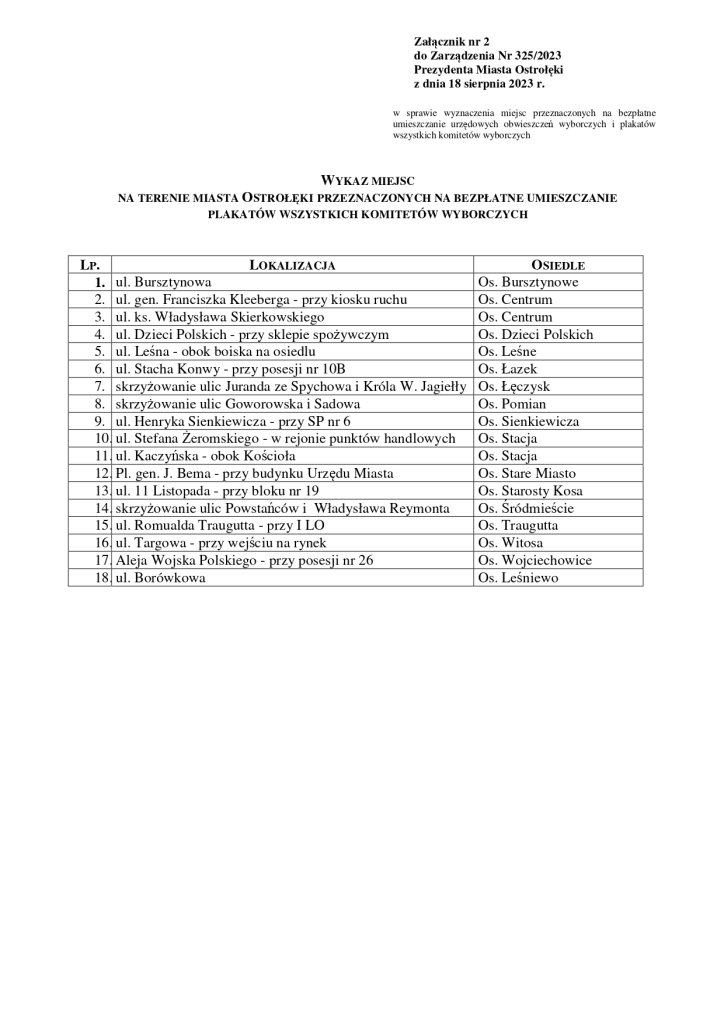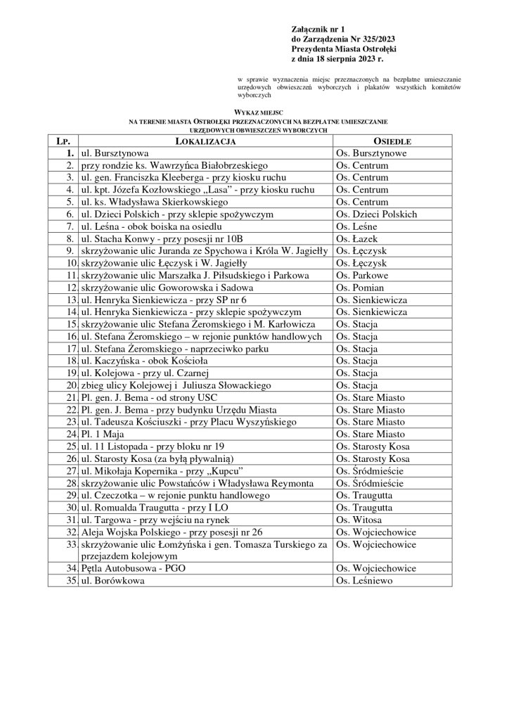 Opublikowane zostało zarządzenie prezydenta Ostrołęki w sprawie wyznaczenia miejsc przeznaczonych na bezpłatne umieszczanie urzędowych obwieszczeń wyborczych i plakatów wszystkich komitetów wyborczych. Jakie to miejsca?