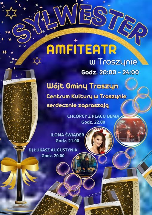 Gmina Troszyn po raz kolejny zaprasza na wyjątkową noc sylwestrową, która odbędzie się w amfiteatrze. Impreza rozpocznie się o godzinie 20:00 i potrwa do północy, wypełniając wieczór niezapomnianymi muzycznymi doznaniami.