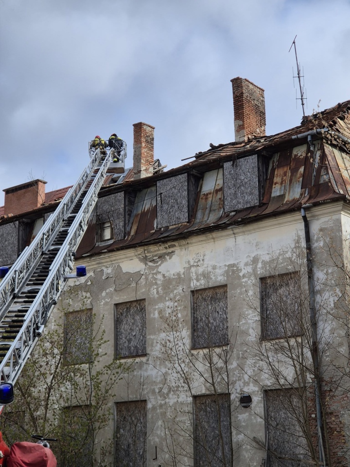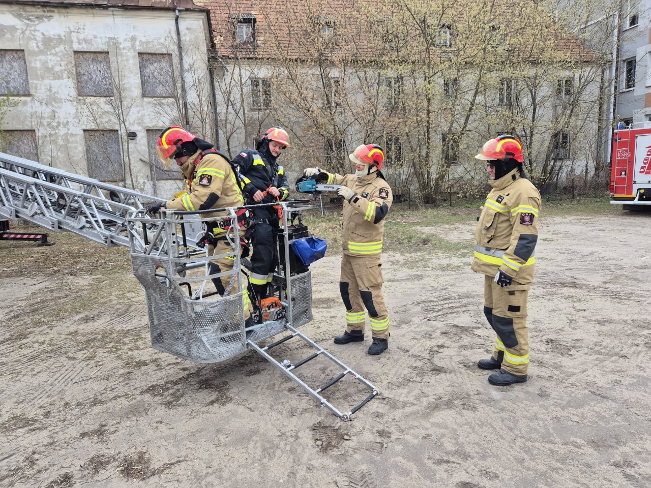 Na miejsce przyjechały zastępy zawodowej straży pożarnej (JRG PSP Ostrołęka) oraz ochotnicy z OSP Ostrołęka. Strażacy wykorzystali drabinę mechaniczną, aby bezpiecznie dostać się do dachu i usunąć luźne elementy konstrukcji, które mogły spaść na dół. W zabezpieczeniu terenu działań pomagali funkcjonariusze Straży Miejskiej.
