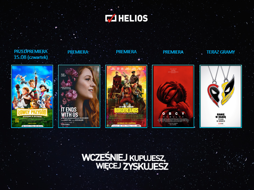 Początek miesiąca okaże się wyjątowo obfity w wyczekiwane przez kinomanów produkcje. W nadchodzącym tygodniu na wielkich ekranach zagoszczą: „It Ends with Us”, „Borderlands” oraz „Obcy: Romulus”. Widzowie kina Helios mogą ponadto liczyć na filmowe hity, różnorodne seanse specjalne i pokazy przedpremierowe.