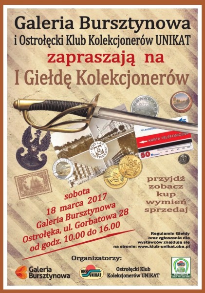 Organizatorami I Giełdy Kolekcjonerów są: Ostrołęcki Klub Kolekcjonerów "Unikat", przy współpracy z Galerią Bursztynową.