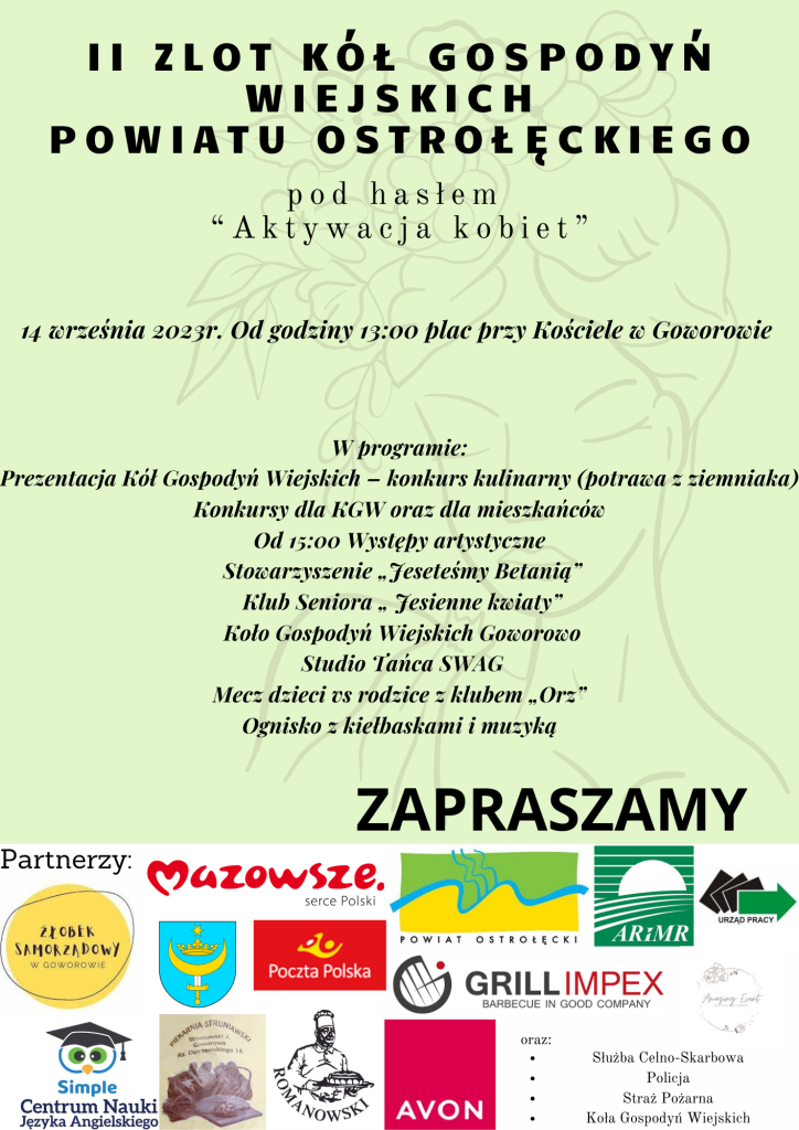 II Zlot Kół Gospodyń Wiejskich Powiatu Ostrołęckiego, 14 września 2023 r. plac przy Kościele w Goworowie, Od godz. 13:00.