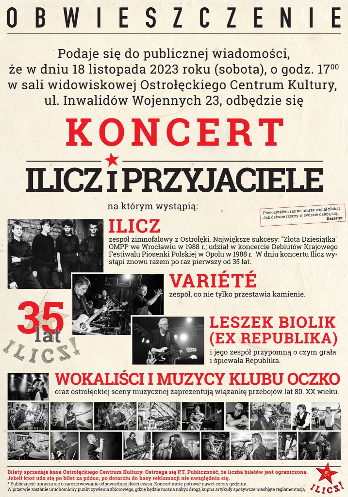 Po 35 latach artyści wraz ze swoimi scenicznymi przyjaciółmi ponownie zagrają niezwykły koncert. Wydarzenia odbędzie się już 18 listopada w sali widowiskowej Ostrołęckiego Centrum Kultury. Zobaczymy i usłyszymy wtedy wokalistów i muzyków Klubu Oczko oraz ostrołęckiej sceny muzycznej. Wystąpi również Leszek Biolik (EX REPUBLIKA), który wraz z zespołem przypomni utwory legendarnej Republiki. Na scenie pojawi się również zespół Variété uznawany za prekursora nurtu cold wave (zimnej fali) w Polsce.