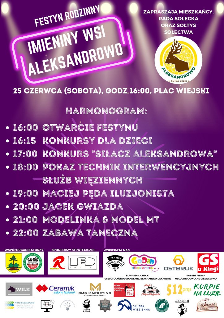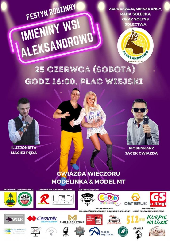 Mieszkańcy, rada sołecka i sołtys Aleksandrowa zapraszają na letni festyn organizowany pod hasłem “Imieniny Wsi Aleksandrowo”. W programie wiele atrakcji i koncerty gwiazd disco.