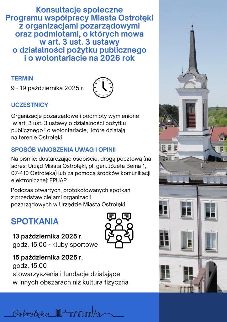 Prezydent Miasta Ostrołęki zaprasza do udziału w konsultacjach społecznych projektu „Programu współpracy Miasta Ostrołęki z organizacjami pozarządowymi oraz podmiotami, o których mowa w art. 3 ust. 3 ustawy o działalności pożytku publicznego i o wolontariacie na 2026 rok”.