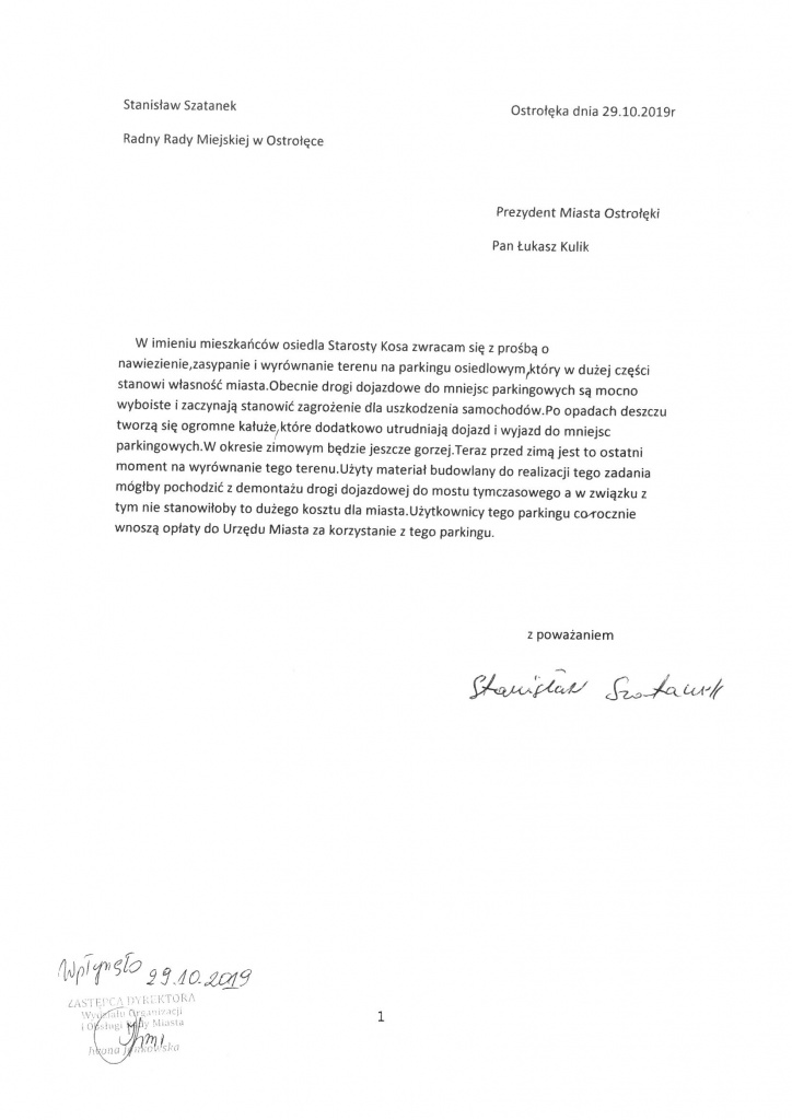Wiceprzewodniczący rady miasta Stanisław Szatanek zwrócił się o naprawę jednego z parkingów na osiedlu Starosty Kosa. Choć w interpelacji nie uniknął błędów językowych, to inicjatywa poparta jest argumentami, radny przedstawił nawet propozycję rozwiązania problemu.