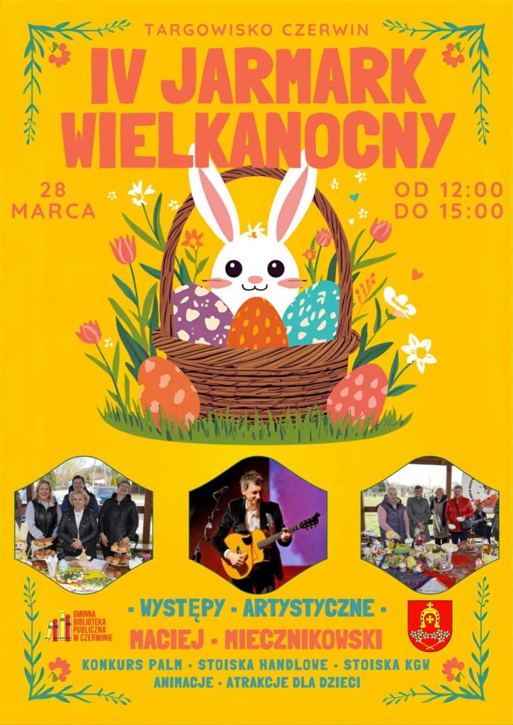 Już w sobotę, 28 marca, na targowisku wiejskim „Mój Rynek” w Czerwinie odbędzie się IV Jarmark Wielkanocny. Impreza zaplanowana w godzinach 12:00-15:00 połączy handel regionalnymi produktami z bogatym programem artystycznym.