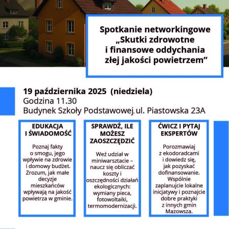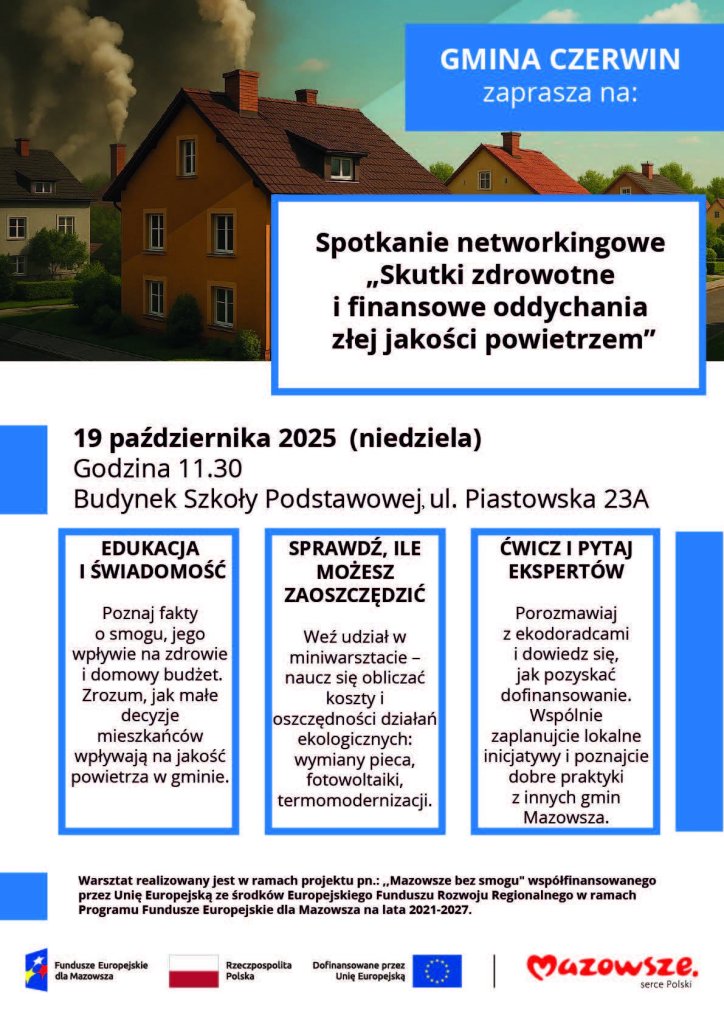 Już 19 października 2025 r. o godzinie 11:30 w budynku Szkoły Podstawowej przy ul. Piastowskiej 23A w Czerwinie odbędzie się otwarte spotkanie dla mieszkańców pod hasłem: „Skutki zdrowotne i finansowe oddychania złej jakości powietrzem!”. Władze gminy Czerwin serdecznie zapraszają wszystkich zainteresowanych do wzięcia udziału w dyskusji o tym, jak wspólnie zadbać o czyste powietrze i jednocześnie zaoszczędzić na domowych rachunkach.