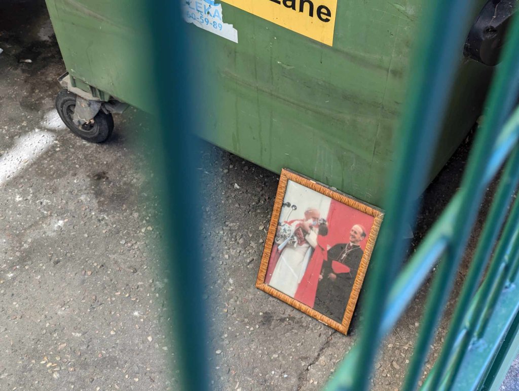 Zdjęcia na śmietniku znalazły się we wtorek 3 września. Jedno zdjęcie oparte było wewnątrz wiaty śmietnikowej o kontener, drugie - o samą wiatę śmietnika. Ktoś najwyraźniej zdecydował pozbyć się oprawionych zdjęć papieża Polaka i wyniósł je na śmietnik. Albo znalazły się w śmietniku i później ktoś wyjął je, by mógł zabrać je ktoś inny albo... sam wyrzucający postanowił w ten sposób coś przekazać.