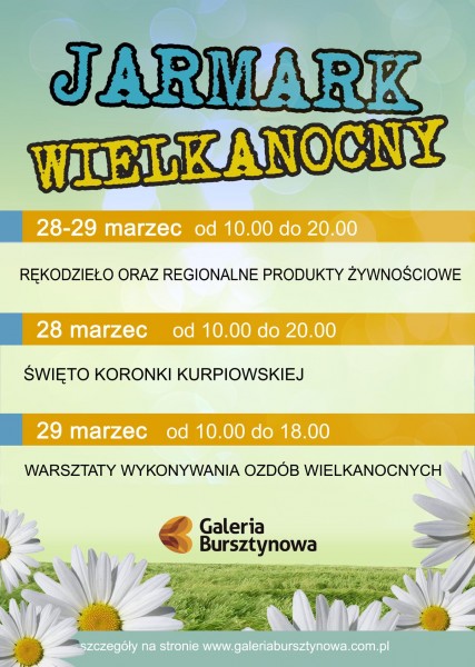 Folklor i tradycja zagości ponownie w Galerii Bursztynowej. W tej przedświątecznej atmosferze, centrum handlowe organizuje 28 i 29 marca Jarmark Wielkanocny połączony z Świętem Koronki Kurpiowskiej oraz warsztatami wykonywania ozdób świątecznych dla dzieci i dorosłych