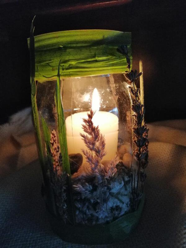 -JESIENNY LAMPION – oklejanie szklanego naczynia materiałami pochodzenia naturalnego ( zasuszone liście, kwiaty, lawenda), napełnienie pojemnika do połowy piaskiem lub ryżem aromatyzowanym, umieszczenie w środku źródła światła, gry w technologii 3D i 360 stopni