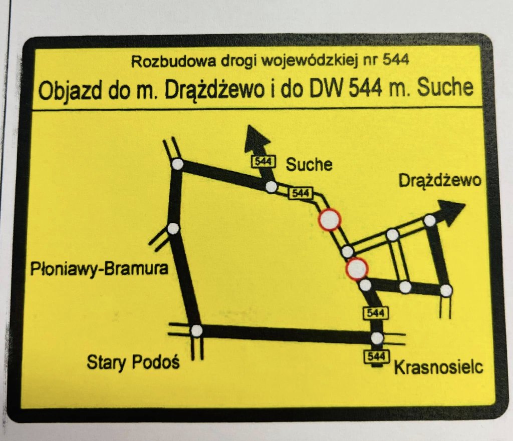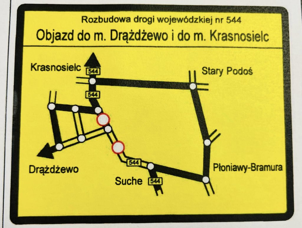 - Objazdy: Dla mieszkańców i podróżujących przewidziano alternatywne trasy: Do miejscowości Drążdzewo można dojechać przez Przytuły. Do Przasnysza prowadzi objazd przez Stary Podoś i Płoniawy-Bramurę