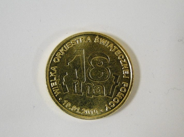 Wielkość ok. 2 złotówki, kolor złoty, avers z napisem: GRAMY DLA DZIECI Z CHOROBAMI ONKOLOGICZNYMI + logo 18 Finału WOŚP, revers z napisem 10.01.2010 WIELKA ORKIESTRA ŚWIĄTECZNEJ POMOCY + drugie logo 18 Finału.