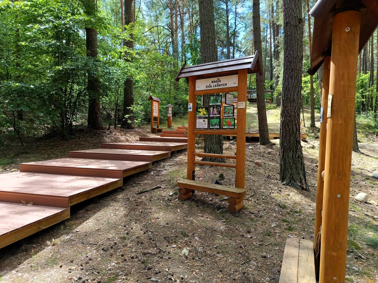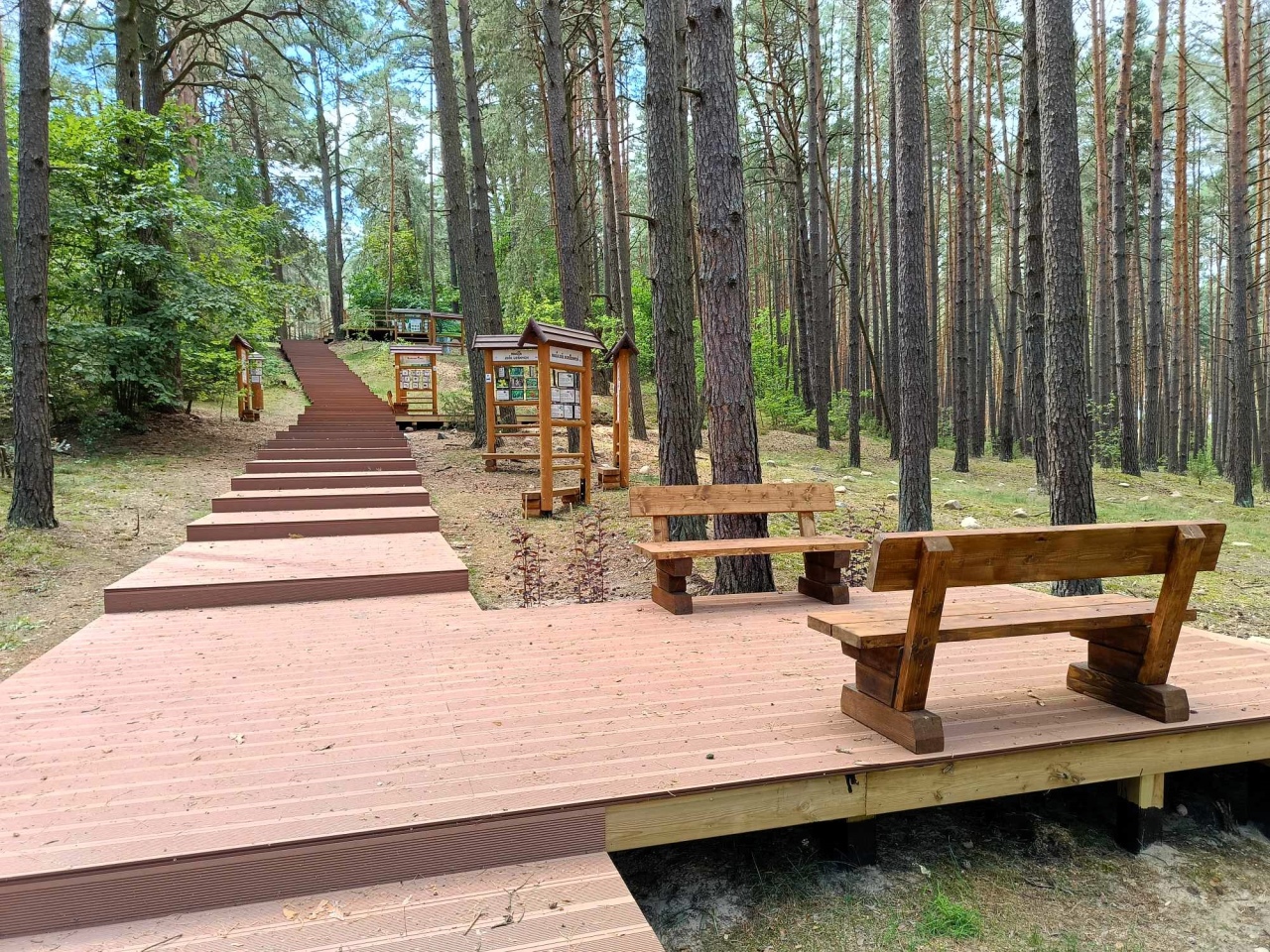 - utrzymanie i konserwacje istniejących ścieżek leśnych tj: poprawa drożności, przycięcie gałęzi, usunięcie przeszkód terenowych, naprawa nawierzchni, niwelacja stromych odcinków poprzez zastosowanie stopni terenowych, tyczenie szlaków za pomocą naturalnych ograniczników (kamień, bale drewniane). Ponadto wykonano zejście piesze i podesty o konstrukcji z belek drewnianych wykończonych deską kompozytową.