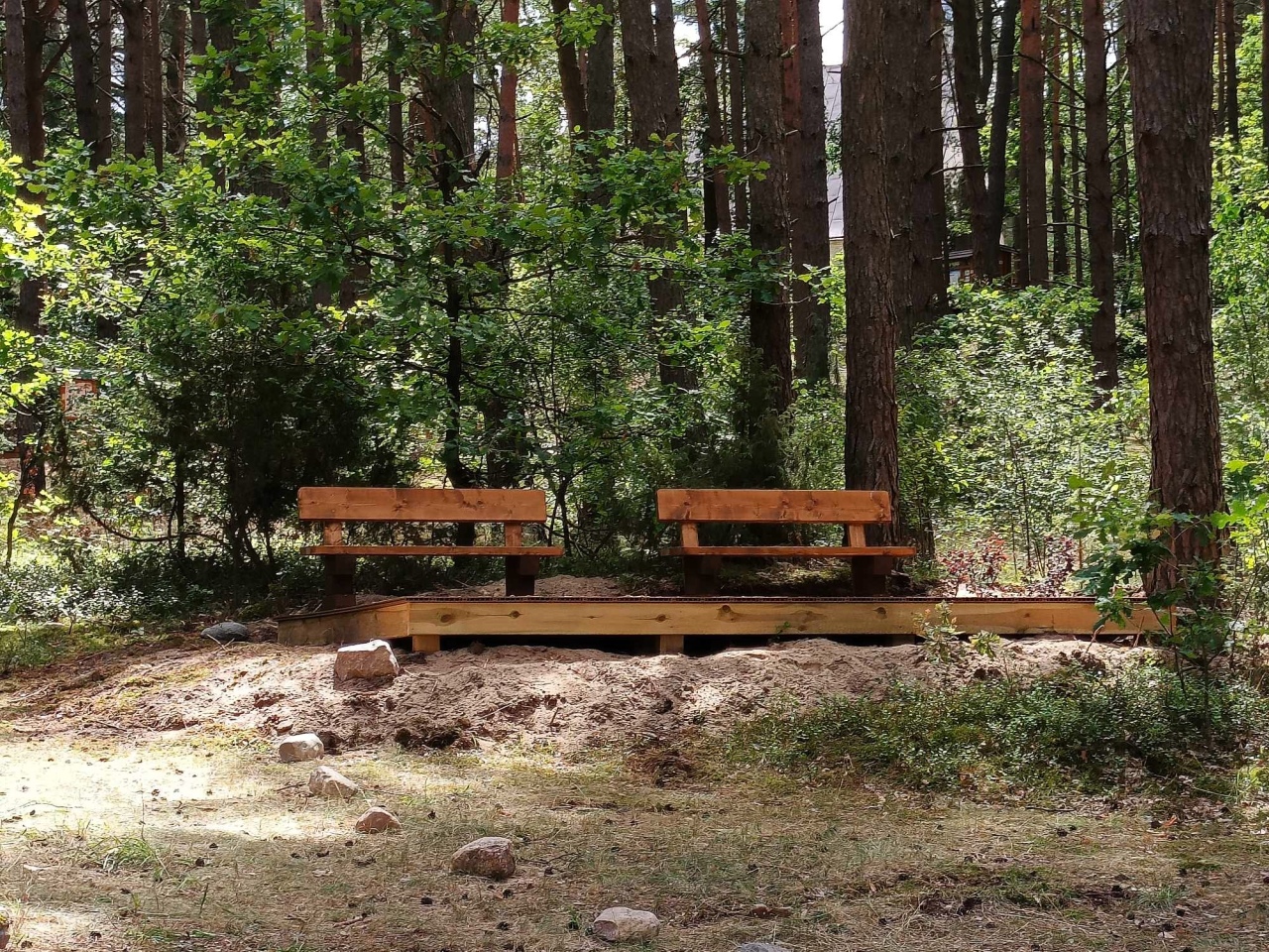 - dostawę i montaż elementów małej architektury w postaci ławek z bali drewnianych, tablicy informacyjnej i koszy na śmieci;
