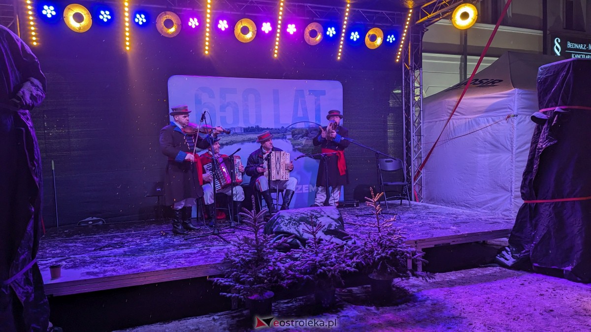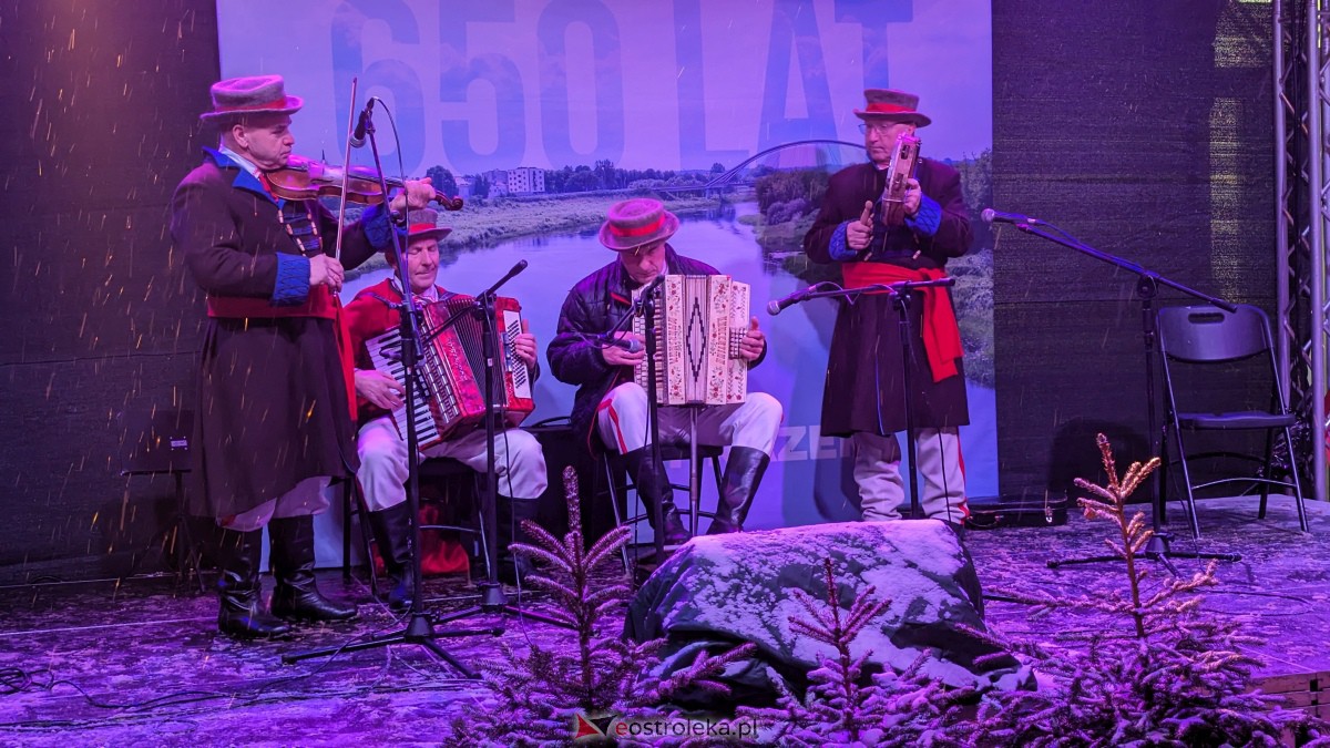 Ludowa Kapela Kurpiowska z Zawad, która wystąpiła podczas części artystycznej jarmarku wprowadziła swoim repertuarem niesamowity klimat. Świąteczną atmosferę podkreślał sypiący z nieba śnieg, aromat wigilijnych potraw serwowanych na stoiskach wokół ratusza oraz blask światełek zdobiących Plac Bema i ostrołęcką “starówkę”.