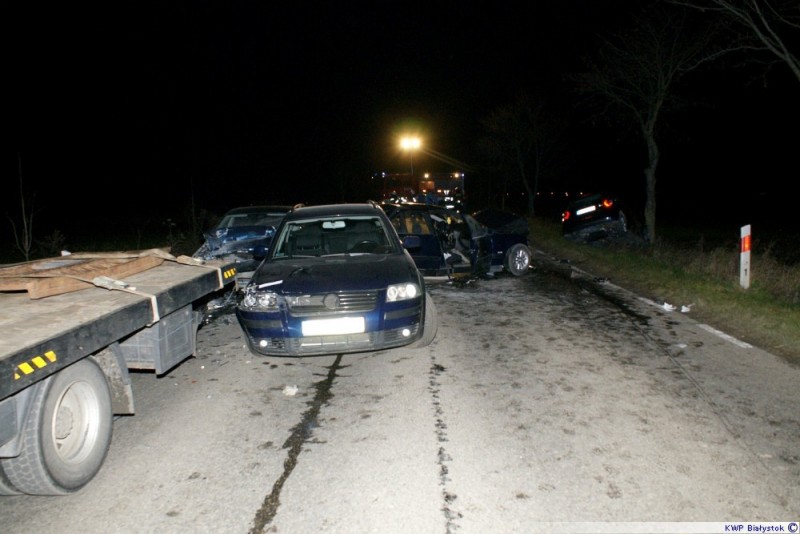 Wczoraj tuż po godzinie 17.00 dyżurny Komendy Miejskiej Policji w Łomży został powiadomiony o zderzeniu kilku pojazdów na drodze relacji Mątwica - Nowogród. Mundurowi natychmiast pojechali na miejsce. Tam wstępnie ustalili, że na oczekujące w kolumnie pojazdy najechał 56-letni kierowca golfa. Kierowany przez niego volkswagen uderzył w tył bmw, które przesunęło się do przodu najeżdżając na passata. Ten natomiast zderzył się ze stojącym przed nim ciężarowym manem. Następnie na skutek zderzenia bmw zostało wyrzucone na przeciwległy pas ruchu, gdzie uderzyło w nadjeżdżającego peugeota, którego kierująca próbując uniknąć wypadku zjechała na pobocze i uderzyła w drzewo. W wyniku karambolu cztery osoby trafiły do szpitala - kierowca golfa, dwoje pasażerów bmw oraz pasażer passata. Na szczęście okazało się, że po badaniach trzy osoby wróciły do swoich domów. Na obserwacji pozostała jedynie kobieta podróżująca bmw. Badanie alkomatem wykazało, że wszyscy uczestnicy zdarzenia byli trzeźwi. Teraz przyczyny i dokładne okoliczności wypadku ustalają policjanci z Komendy Miejskiej Policji w Łomży.