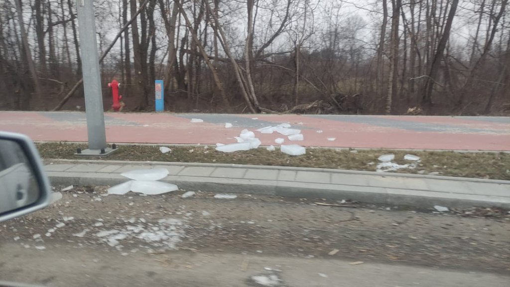 Okolicach rond i większych skrzyżowań na terenie Ostrołęki usiane są sporymi bryłami lodu spadającego z nieoczyszczonych przyczep ciężarówek. To ogromne zagrożenie, szczególnie dla mniejszych aut czy pieszych. Bryła lodu spadająca z naczepy może wyrządzić wiele szkód lub nawet doprowadzić do tragedii.