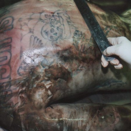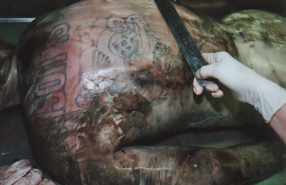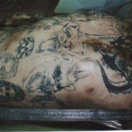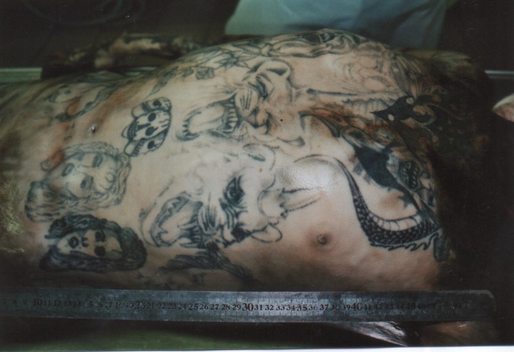 Charakterystycznymi znakami szczególnymi mężczyzny są: na przedniej i tylnej powierzchni tułowia, przedniej i tylnej powierzchni obu kończyn górnych oraz przedniej, przyśrodkowej powierzchni prawej kończyny dolnej i przedniej powierzchni uda lewego bardzo liczne w przeważającej części niebieskawe, barwne tatuaże symboliczne i literowe. W obrębie tatuaży lewego przedramienia liczne pionowe i poziome linijne białawe blizny.