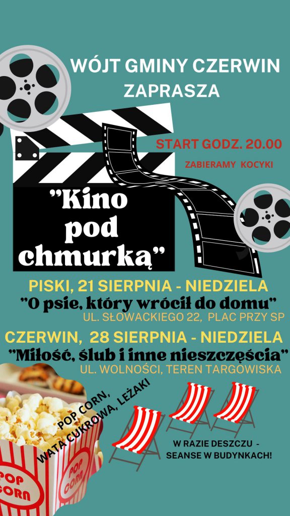 Wójt Gminy Czerwin Grzegorz Długokęcki i Gminna Biblioteka Publiczna w Czerwinie zapraszają na dwa darmowe seanse "kina pod chmurką". Zaplanowano je w dwie kolejne niedziele - 21 i 28 sierpnia.