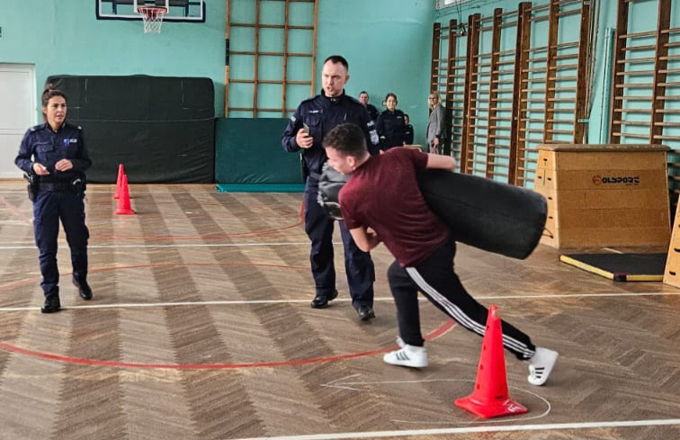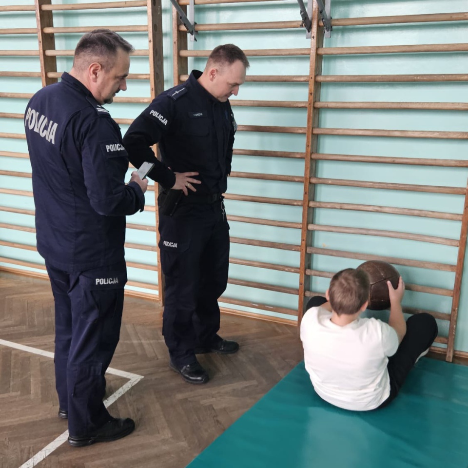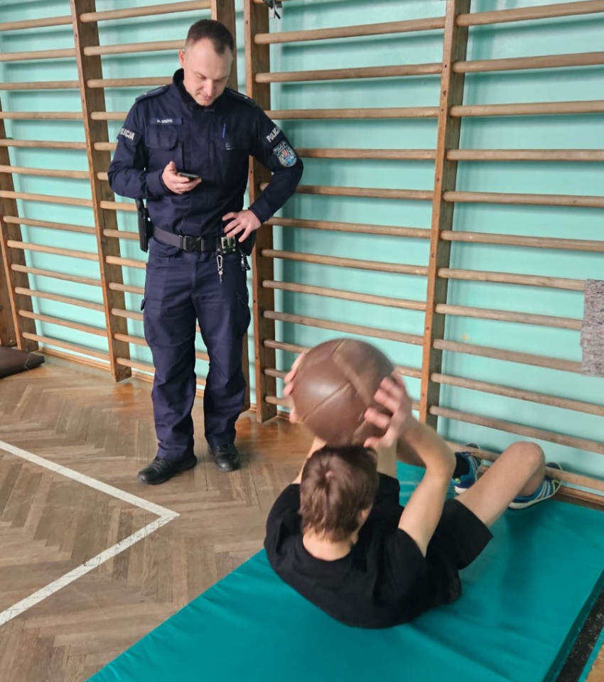Uczniowie podczas sprawdzianu mogli przekonać się z jakimi zmaganiami spotykają się kandydaci do służby w policji. Kadeci musieli, m.in. wykonać okrążenie stojaków, przewroty w przód i w tył, przeniesienie manekina, przeskoki przez płotki, rzuty piłkarskimi lekarskimi na odległość 5 metrów. Wykonywali także „brzuszki” przy drabinkach gimnastycznych, skakali przez skrzynię gimnastyczne oraz pokonywali bieg wahadłowy polegający na przebiegnięciu 10 razy dystansu 5 metrów.