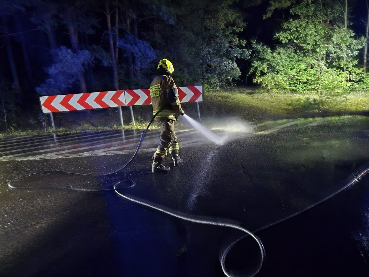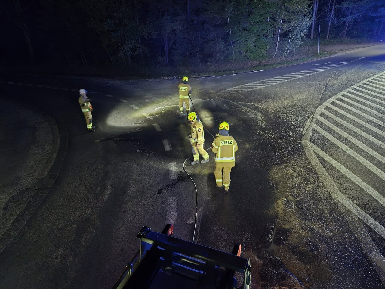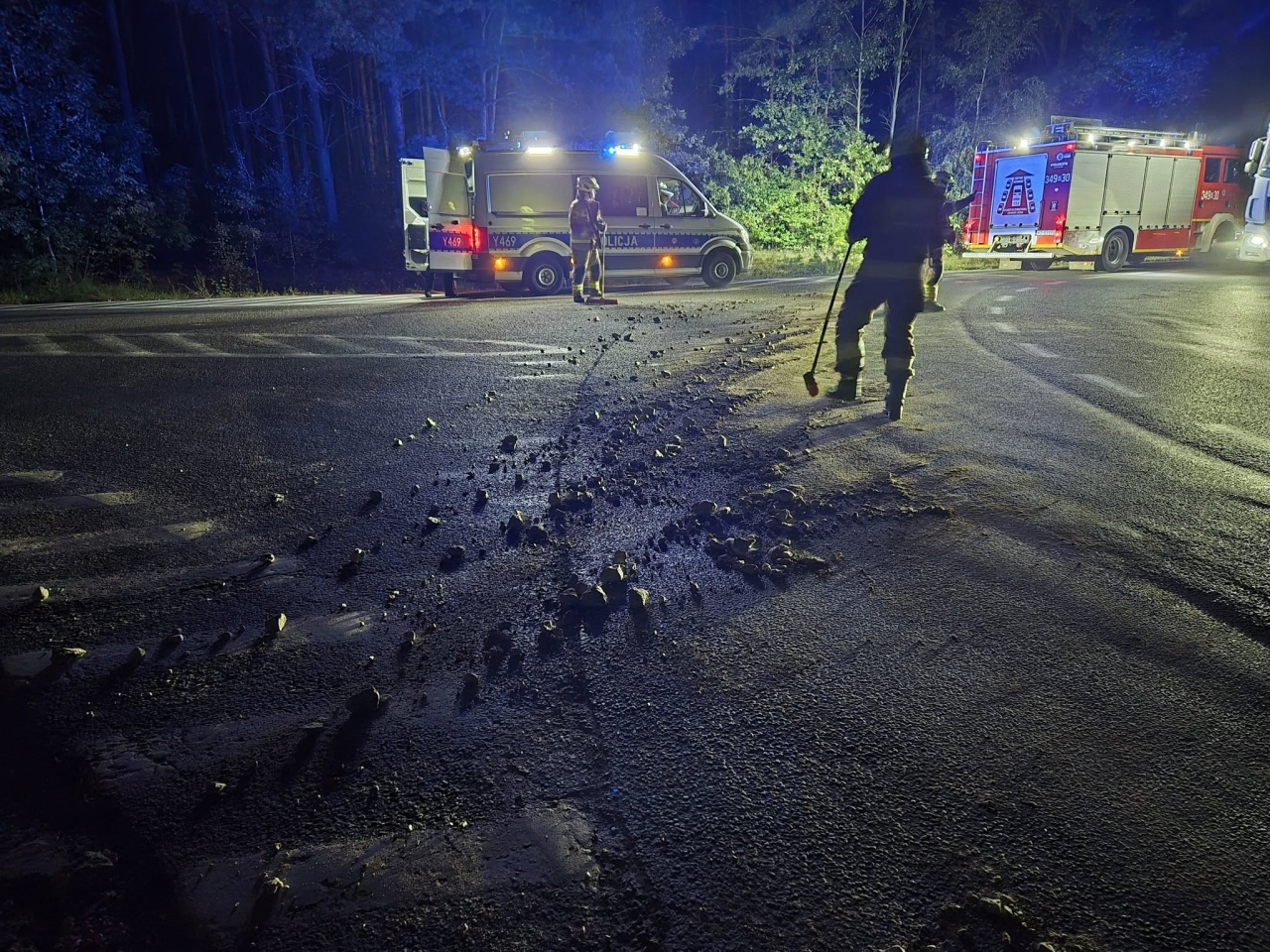 Na miejsce niezwłocznie skierowano druhów z Ochotniczej Straży Pożarnej w Ostrołęce. Ich głównym zadaniem było jak najszybsze uprzątnięcie zanieczyszczonego odcinka jezdni i przywrócenie bezpiecznych warunków ruchu.
