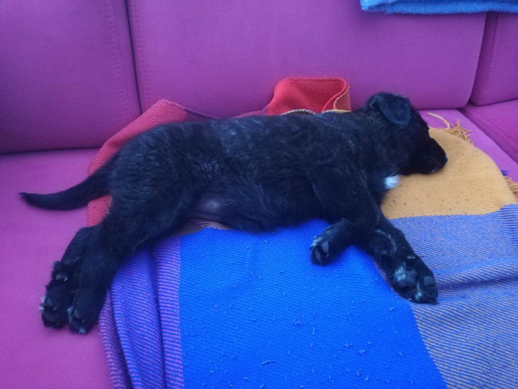 Suczka jest czarna z białym krawacikiem. Może mieć kilka miesięcy. Zwierzak wygląda na zadbanego.