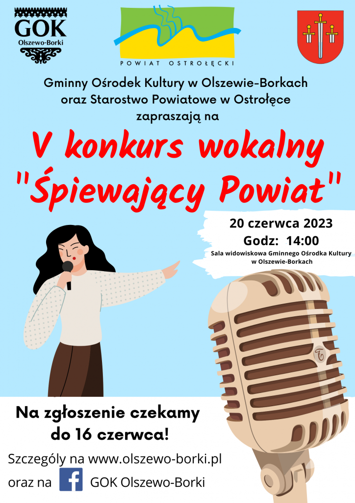 Gminny Ośrodek Kultury w Olszewie-Borkach oraz Starostwo Powiatowe w Ostrołęce zapraszają wszystkich zainteresowanych do udziału w konkursie wokalnym "Śpiewający Powiat".