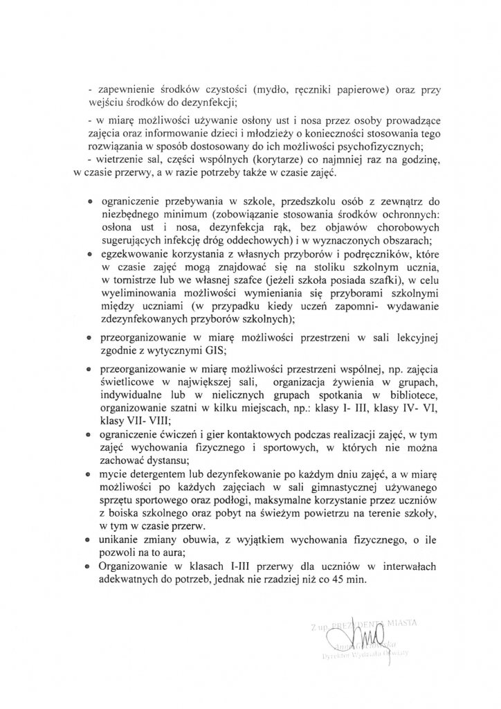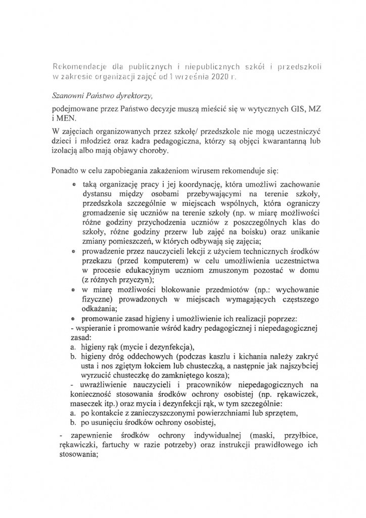 Miasto Ostrołęka opracowało na podstawie szczegółowych wytycznych Głównego Inspektoratu Sanitarnego rekomendacje dla publicznych i niepublicznych szkół i przeszkoli w zakresie organizacji zajęć od 1 września 2020 r. Rekomendacje zostały przesłane drogą mailową do publicznych i niepublicznych szkół i przedszkoli na terenie Miasta Ostrołęki w dniu 28 sierpnia 2020 r. Jednocześnie dyrektorzy szkół/placówek zostali zobligowani do bieżącego śledzenia zmian w wytycznych GIS, MZ i MEN i natychmiastowego reagowanie adekwatnie do potrzeb i możliwości kierowanych przez nich jednostek. Dodatkowo Miasto Ostrołęka przygotowało plakat dotyczący realizacji rekomendowanych zasad skierowany do uczniów szkół. Plakat został przekazany do szkół podstawowych i ponadpodstawowych oraz placówek w Ostrołęce