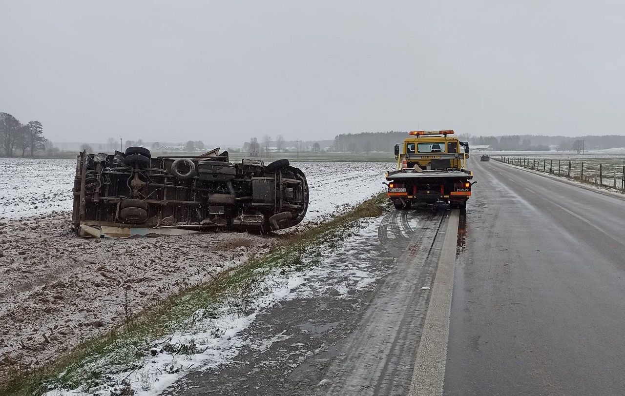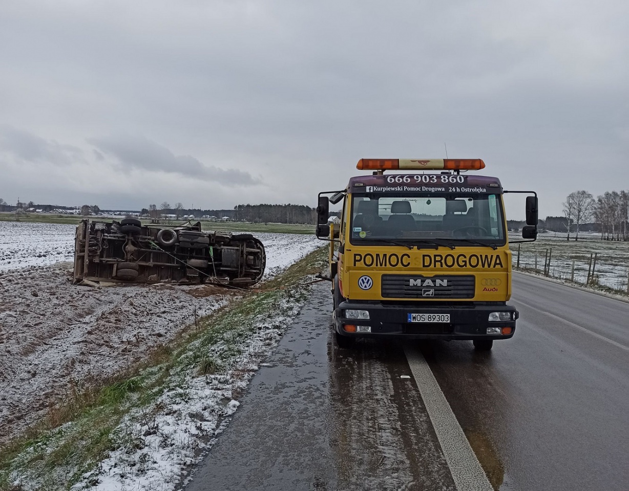 Do zdarzenia doszło w miniony piątek, 18 listopada. Kierujący dostawczym renault stracił panowanie nad pojazdem wpadł w poślizg i wypadł z drogi na pobliskie pole, gdzie auto wraz z ładunkiem wywróciło się na bok.