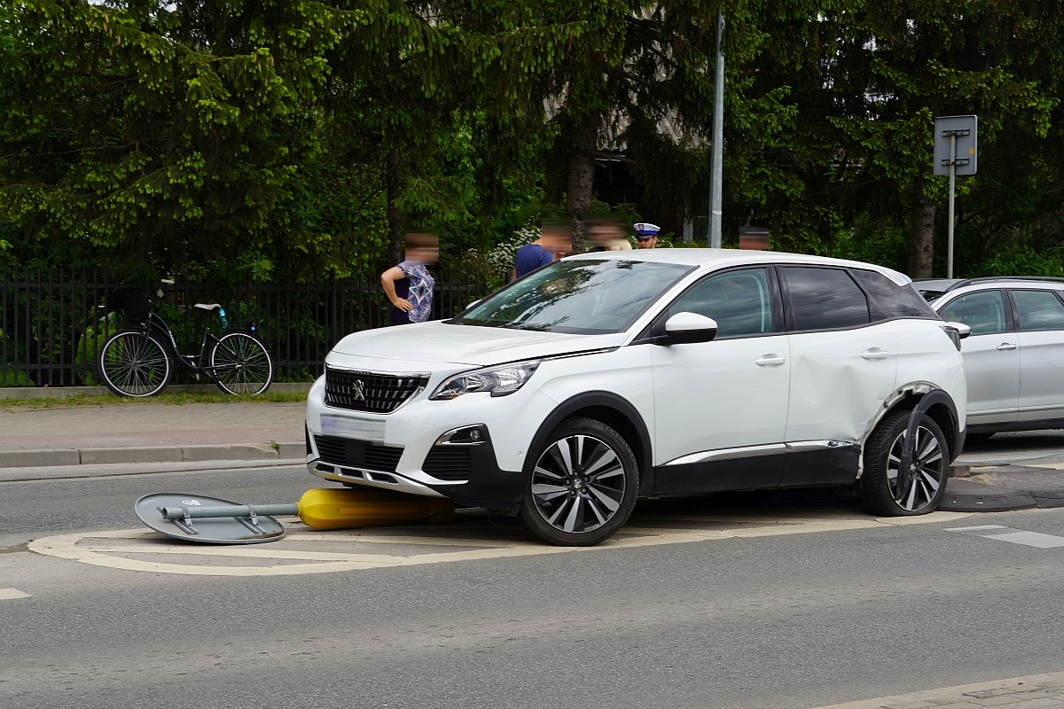 Kraksa w Rzekuniu. Uszkodzone auta i znaki na przejściu dla pieszych. Policja wyjaśnia okoliczności zdarzenia.