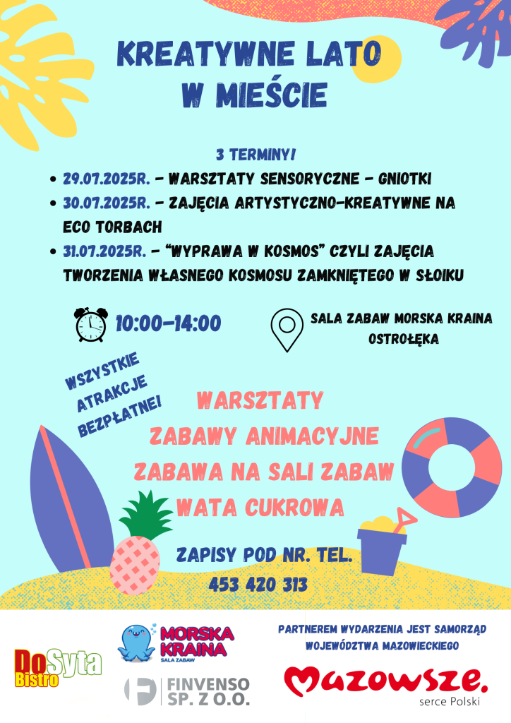 - 30 lipca 2025 roku odbędą się warsztaty artystyczno-kreatywne z wykorzystaniem ekologicznych toreb. Podczas nich dzieci będą mogły wyrazić siebie poprzez malowanie i ozdabianie torb, używając farb i artykułów plastycznych, co pozwoli im na tworzenie unikalnych, osobistych projektów.