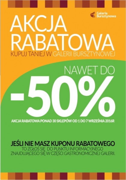 W Galerii Bursztynowej w dniach 1-7 września w ramach akcji rabatowej będzie można skorzystać aż z 36 kuponów rabatowych. Jest to największa akcja rabatowa w Galerii od momentu jej otwarcia. Wśród okazji zakupowych znajdują się kupony do punktów gastronomicznych KFC, Dominium, Cafe Rialto, Blueberry, New York Hot Dog, do sklepów odzieżowych , obuwniczych i z biżuterią. Znajdziecie również zniżki na usługi, smartfony, tablety, telewizory, upominki, zabawki, wyposażenie mieszkań, art. szkolne i papiernicze, wejścia do Centrum Zabaw Figlarium i inne.