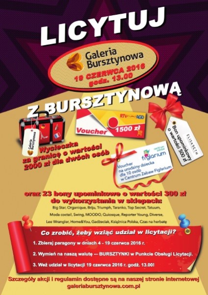 Nagrodami głównymi w akcji „Licytuj z Bursztynową” są: Voucher na wycieczkę za granicę dla dwóch osób o wartości 2000 zł, voucher na urodziny dziecka w Figlarium dla 10 osób, bon upominkowy o wartości 1500 zł do wykorzystania w RTV Euro AGD, bon upominkowy do wykorzystania w salonach Elisabeth o wartości 500 zł. Dodatkowo, do wylicytowania będzie ponad 20 bonów upominkowych o wartości 300 zł do wykorzystania w sklepach Galerii Bursztynowej.