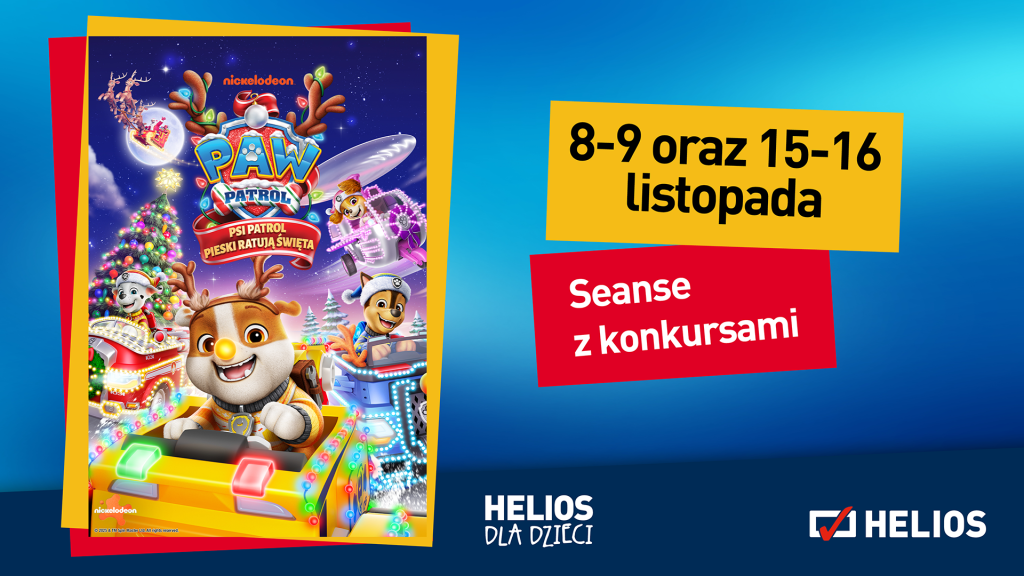 W najbliższy weekend, 8 i 9 listopada, kino Helios przygotowało również wyjątkowe seanse z konkursami „Psi patrol. Pieski ratują święta”. Gdy wszyscy mieszkańcy Miasta Przygód dowiadują się, że Święty Mikołaj przeziębił się i Boże Narodzenie zostało odwołane, burmistrz Humdinger postanawia udać się na Biegun Północny i zabrać wszystkie prezenty dla siebie…