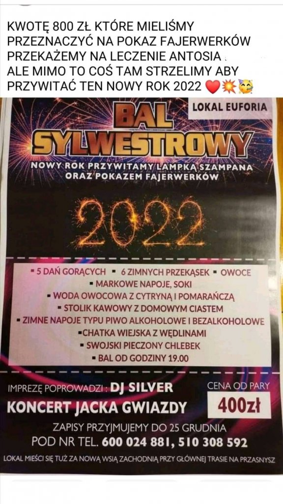Kwotę 800zł, które mieliśmy przeznaczyć na pokaz fajerwerków przekażemy na leczenie Antosia Mazura.