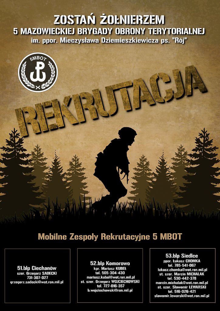 Osoby pochodzące z powiatu ciechanowskiego płońskiego, mławskiego i żuromińskiego, które są zainteresowane służbą w 5MBOT mogą kontaktować się z przedstawicielem Mobilnego Zespołu Rekrutacyjnego 51 blp: