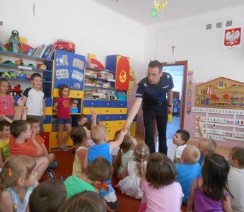 fot. PM nr 8Spotkanie z przedszkolakami miejskiej „ósemki” poprowadził sierż. Tomasz Żerański z Komendy Miejskiej Policji w Ostrołęce. Tematyka pogadanki dotyczyła m.in. bezpieczeństwa w ruchu drogowy, nad wodą i na basenie, jak zachować się w kontakcie z osobami obcymi oraz jak mądrze i rozsądnie korzystać z uroków wakacyjnego wypoczynku.
