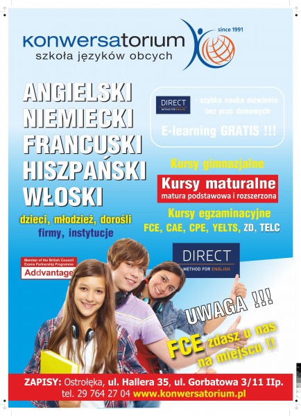 Bliższe informacje o kursach oraz zapisy: Szkoła Języków Obcych KONWERSATORIUM, ul. Generała J. Hallera 35, ul. Generała A. Gorbatowa 3/11 ( na przeciwko drogerii Rossman ), Ostrołęka, telefon: 29 764 27 04, poniedziałek – piątek 10.00- 19.00, sobota 9.00-14.00.