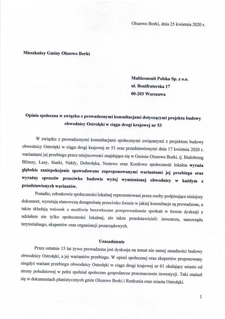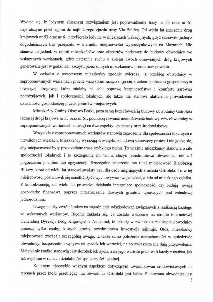 Ponad 430 mieszkańców gminy Olszewo-Borki krytycznie wyraziło się o wszystkich wariantach planowanej obwodnicy Ostrołęki. Lista podpisów trafiła już do firmy Multiconsult, prowadzącej akcję konsultacyjno-informacyjną. Dotarliśmy do treści opinii mieszkańców.